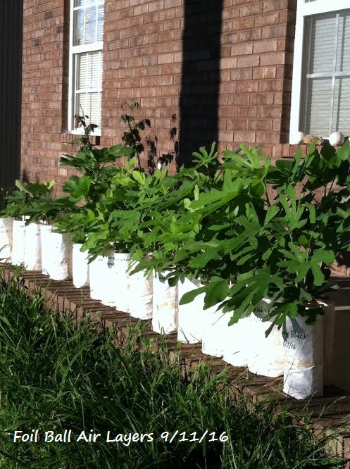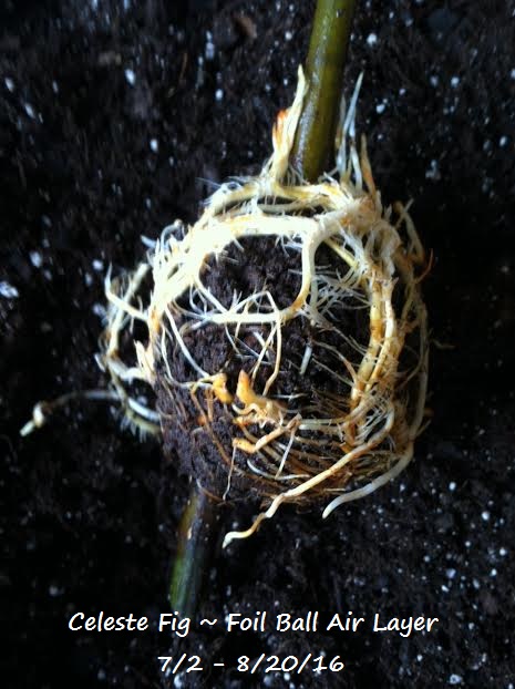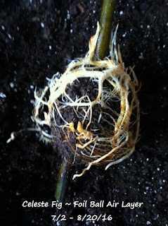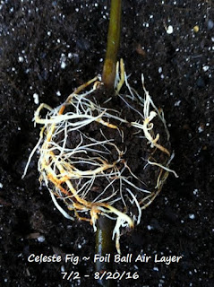 Next several photo's are successful foil ball air layers. Pure wood chip and leaf compost proved to be the superior media choice. Peat worked as long as it didn't get saturated from rain getting in without drain holes. See if you can tell the peat ones from the compost...